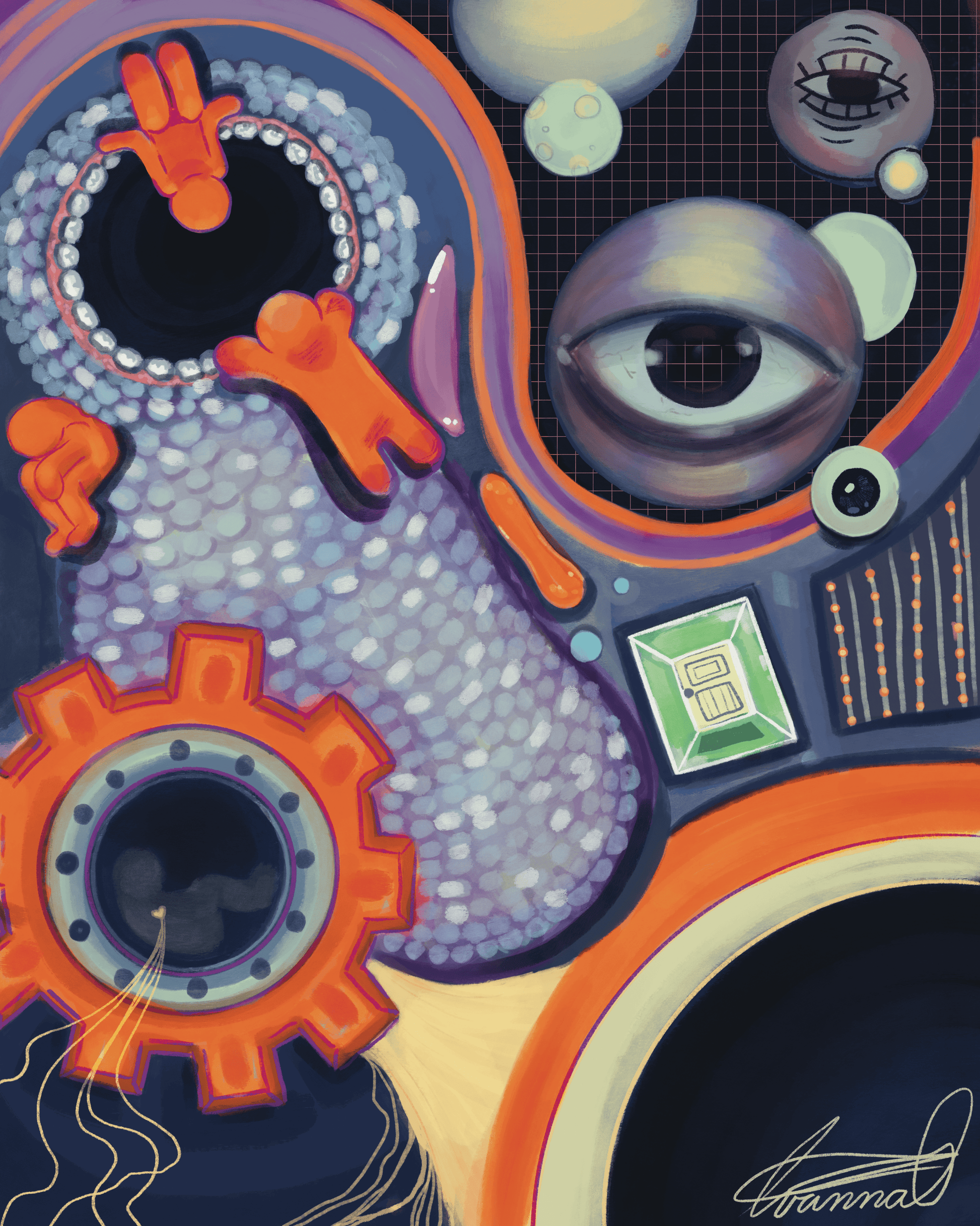 A haunting, multi-mouthed portrait dominated by shades of lush purple and lilac. The enormous eye reflects a starry, blue inner world, while the fur-like textures and multiple mouths—each with tiny, detailed teeth and braces—create a feeling of sensory overload and fragmented identity.