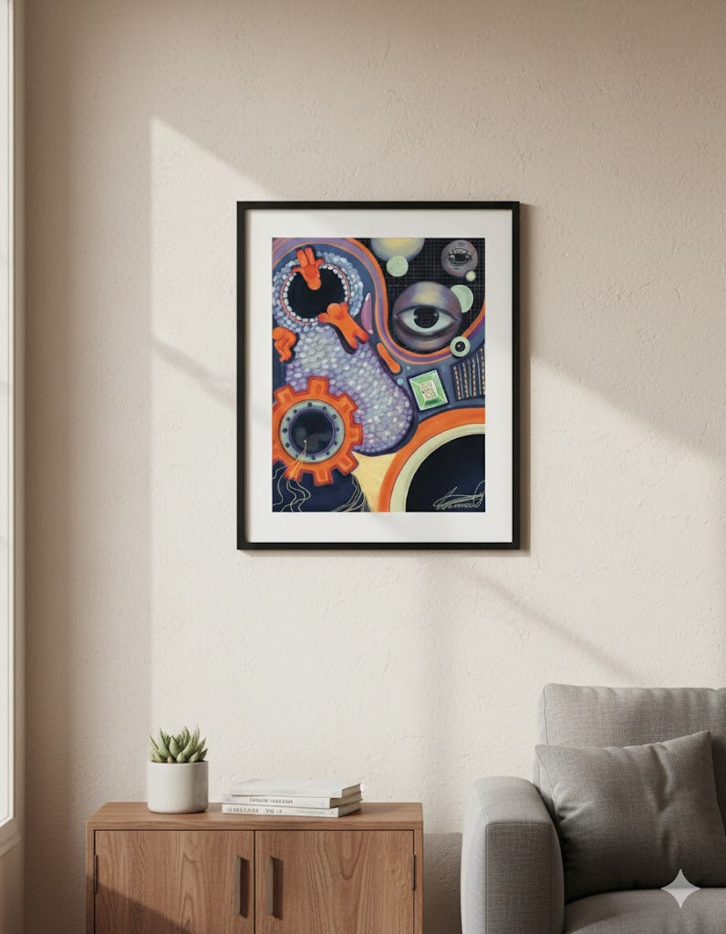 Psychedelic Interpretation: This represents the dissolution of the unified self, where the familiar face breaks into component parts. The multiple mouths symbolize the difficulty in communication or the cacophony of inner voices, while the moon-filled eye is the "third eye" opening to an internal, nocturnal universe.