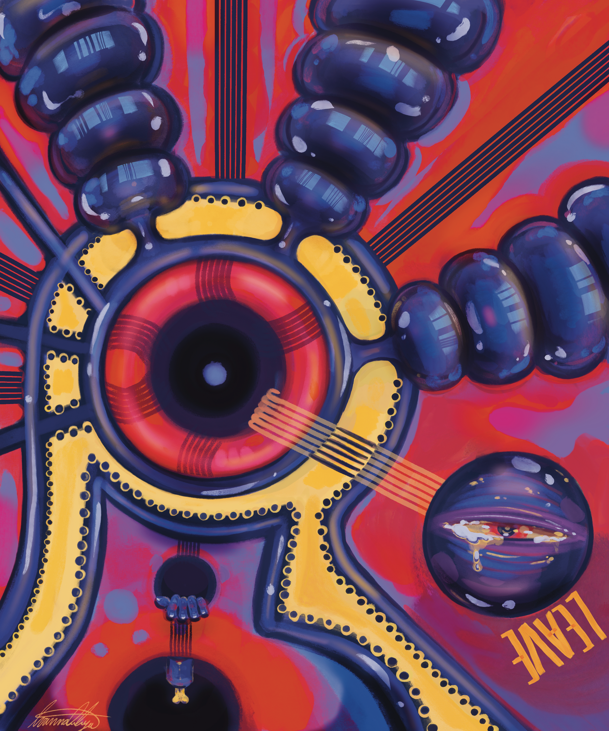 The central structure looks like a mechanism, but the real heart is that small, weeping eye trapped in the corner. That tearful detail, along with the word 'LEAVE,' captures that vulnerable, final moment of release. It's a bold, high-energy artwork about necessary endings and letting go—a perfect conversation piece for your collection.